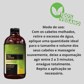 Modo de uso: Com os cabelos molhados, retire o excesso de água, aplique uma quantidade ideal para o tamanho e volume dos seus cabelos e massageie suavemente, deixe a espumação agir entre 2 a 3 minutos, enxágue totalmente. Repita a aplicação se necessário.