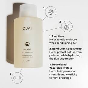 - Walk This OUAI, Wash This OUAI - O shampoo para cães Fur Bebe contém aloe vera para condicionar o pelo, extrato de semente de rambutan para proteger o pelo da poluição enquanto hidrata a pele por baixo, proteína vegetal hidrolisada para melhorar a força e elasticidade do pelo para combater a quebra e pantenol para dar um acabamento brilhante aos pelos dos cães.