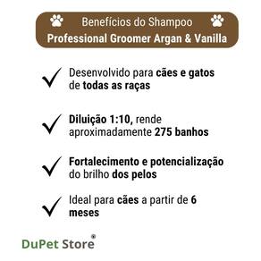 Linha Professional Groomer, expertise profissional para o tratamento dos fios!\nShampoo Argan e Vanilla , galão de 5 litros diluição 1 x 10 .\nA linha Professional Groomer é o cuidado extra que faltava para pelos secos e danificados. Suas formulações com a tecnologia exclusiva PRO-REBUILDER reparam o sistema de proteínas e reestruturam os fios, estimulando o crescimento saudável, proporcionando hidratação, nutrição, regeneração e brilho tridimensional. A linha ainda conta com a tecnologia DRY-FAST, que protege e auxilia no preenchimento e alinhamento das cutículas, isolando a umidade em excesso na camada superficial, acelerando o tempo de secagem em até 2x mais.