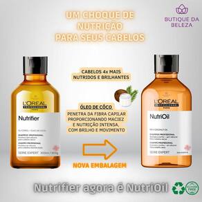 A linha nutrifier agora é nutrioil.A linha nutrioil de l'oréal professionnel é a solução ideal para cabelos mais nutridos e com muito mais brilho.Loreal nutrioil é uma linha de nutrição profunda à base de óleo de coco, que unido ao glycerol, o ingrediente é capaz de nutrir e hidratar profundamente os fios, melhorando o aspecto ressecado e desalinhado.Shampoo l'oréal professionnel nutrioilO shampoo nutrioil de loreal professionnel é a solução ideal para cabelos mais nutridos e com muito mais brilho. Sua fórmula profissional é enriquecida com óleo de coco em uma textura leve que confere a dose certa de nutrição sem pesar os fios. Com nutrioil, os cabelos se transformam instantaneamente: 4x mais nutridos, mais macios e com muito mais brilho.Indicado- cabelos secos.- cabelos ressecados.- cabelos desnutridos.- cabelos opacos.- cabelos com frizz.- todos os tipos de cabelos.Benefícios- limpeza.- cabelos 4x mais nutridos- brilho intenso.- maciez.- hidratação.- redução de perda proteica.Modo de uso- shampooDistribuir uniformemente o shampoo por todo o cabelo molhadoE fazer espuma. Enxaguar completamente.Repetir o processo se necessário.