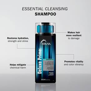 Truss O xampu Deluxe Prime limpa, reduz os danos ao cabelo com produtos químicos e protege contra agressões diárias e térmicas. Limpa suavemente, reduzindo danos químicos ao cabelo, hidrata e veda as cutículas. Dá suavidade e brilho ao cabelo e tem uma ação anti-desbotamento.