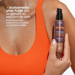 Shining like the sun’ — é assim que você vai se sentir com o PROTETOR SOLAR ILUMINADOR CORPORAL SHINE. Com partículas douradas de brilho, ele protege sua pele enquanto deixa um acabamento glow super radiante, seja para brilhar nos treinos ou para levar mais elegância para o look daquele evento especial.