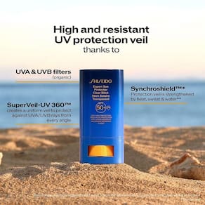 O Shiseido Expert Clear Stick é um protetor solar em bastão transparente e portátil, ideal para quem busca proteção alta contra raios UV com aplicação prática e invisível no dia a dia. Com tecnologia SynchroShield? que reforça a barreira protetora ao contato com calor, água ou suor, ele oferece defesa broad-spectrum enquanto hidrata e previne sinais de envelhecimento, proporcionando uma transformação de pele exposta em uma barreira segura e fresca, criando uma conexão emocional de liberdade e tranquilidade que permite desfrutar do sol com confiança absoluta.