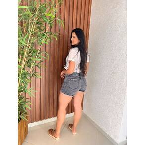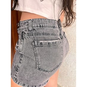 O short é uma peça jeans de lavagem escura e cintura alta. Ele tem um corte mais curto, com a barra desfiada e algumas costuras visíveis na parte frontal, que ajudam a modelar a peça. O design inclui bolsos grandes e utilitários, e o fechamento parece ser por zíper e botão. Marca: Não Informado