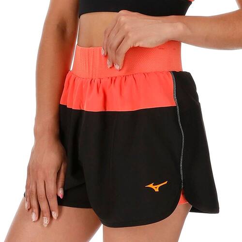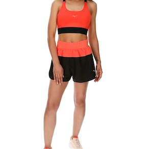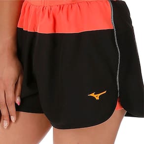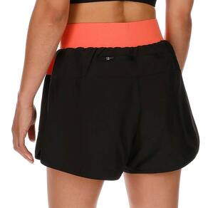 Shorts confeccionado em tecido plano de poliéster com elastano e com bermuda interna e cós em malha. Bolso traseiro com zíper. Costura flatlock com fita refletiva. Logo refletivo.