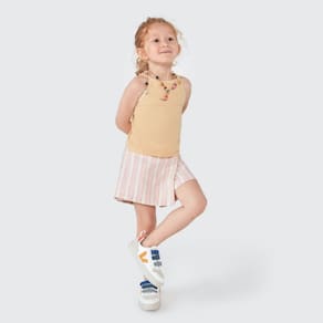 Confeccionada em malha 100% algodão, esta saia traz durabilidade e cor vibrante por mais tempo. O design com elástico no cós na parte das costas e transpasse frontal adiciona um toque de sofisticação, enquanto o detalhe de fivela na lateral da cintura garante um visual charmoso e moderno. Ideal para compor looks casuais ou mais arrumados, este shorts saia oferece o equilíbrio perfeito entre estilo e conforto para as pequenas.