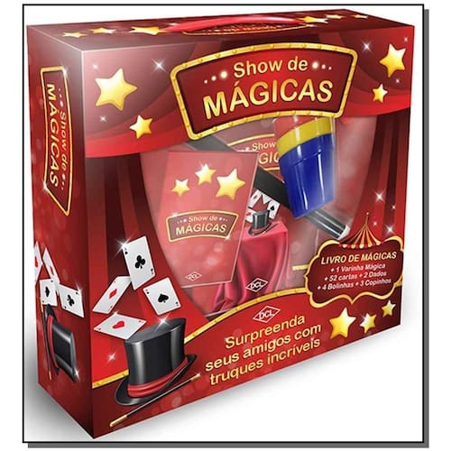 Surpreenda seus amigos com truques incríveis! São vários truques superlegais, com diversos instrumentos e dicas bacanas para você melhorar sua performance! Contém: 1 varinha mágica, 1 baralho com 52 cartas, 2 dados, 3 copinhos, 4 bolinhas e 1 livro de mágicas.