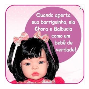 Boneca Baby Kiss Morena 51cm Tipo Reborn Sidnyl 910 Chora e Balbucia A Boneca Baby Kiss é perfeita para encantar qualquer criança. Além de ser uma boneca sofisticada com alto padrão de qualidade, basta você apertar a barriguinha dela para chorar e balbuciar como um bebê de verdade. Baby Kiss estimula a interação entre pais e filhos, coordenação manual, estimula a criatividade e imaginação da criança, para deixar a brincadeira ainda mais divertida. Ela é delicada e compõe um delicioso cheirinho de bebe perfumada. Especificações: - Produto: Boneca Baby Kiss - Marca: Sidnyl - Modelo: Tipo Reborn - Referência: 910 - Medida da boneca em Pé: 51 cm - Instruções: Ao apertar a barriga da boneca, ela chora e balbucia - Funcionamento: 3 baterias AG13/LR44 inclusas - Material: Cabeça, pernas e braços em vinil. Corpo em Tecido TNT com enchimento de algodão atóxico - Certificado de segurança: INMETRO CE-BRI/IQB – 167 NM 300/2002 Conteúdo: - 1 Boneca