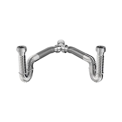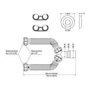 Sifão Duplo Sanfonado Extensível Censi 72cm Cromado Cor: Cromado Garantia: 1 ano junto ao fabricante Referência: 7159 Temperatura Máxima da Água: 90C Comprimento Aberto: 72cm Comprimento Fechado: 36 cm Composição: Elastômeros e plástico de engenharia Itens inclusos: 1 Sifão com dois tubos extensíveis 1 Canopla 2 Suportes