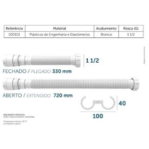 Sifão flexível universal branco - blukit Sifão flexível universal branco - blukit Feito à base de plástico de engenharia os sifões blukit são de alta durabilidade, não aderem a gordura e resistem a água quente com temperaturas de até 90ºc. Além disso, aguentam a baixa e alta pressão, apresentando uma ótima vedação em todas suas aplicações. Material plásticoComprimento aberto 720mmComprimento fechado 330mmGarantia 12 meses com o fabricantePode ser adaptado para : dn38 /dn40 /dn 48 / dn 50 Descrição:Sifões tubos extensivos blukit são a melhor opção para quem busca um produto versátil e prático para escoamento de águas servidas dos ambientes. Fabricados em plásticos de engenharia, ultrarresistentes que suportam extremas temperaturas da água, com acabamento branco ou cinza. Seu uso correto assegura um ambiente livre dos maus odores do esgoto. Qualidade para você