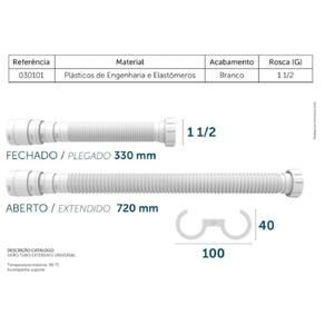 Sifão flexível universal branco - blukit Sifão flexível universal branco - blukit Feito à base de plástico de engenharia os sifões blukit são de alta durabilidade, não aderem a gordura e resistem a água quente com temperaturas de até 90ºc. Além disso, aguentam a baixa e alta pressão, apresentando uma ótima vedação em todas suas aplicações. Material plástico Comprimento aberto 720mm Comprimento fechado 330mm 12 meses com o fabricante Pode ser adaptado para : dn38 /dn40 /dn 48 / dn 50 Descrição: Sifões tubos extensivos blukit são a melhor opção para quem busca um produto versátil e prático para escoamento de águas servidas dos ambientes. Fabricados em plásticos de engenharia, ultrarresistentes que suportam extremas temperaturas da água, com acabamento branco ou cinza. Seu uso correto assegura um ambiente livre dos maus odores do esgoto. Qualidade para você