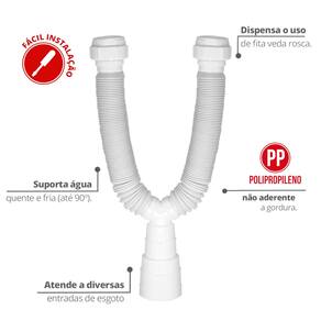 💎 BENEFÍCIOS DO PRODUTO • Conexão Dupla: Permite ligar dois aparelhos sanitários a um único ponto de esgoto, otimizando a instalação. • Sistema Universal: Inclui Bucha de Redução Universal (compatível com saídas de 7/8”, 1.1/2” e 1.1/4”). • Vedação Prática: Dispensa o uso de fita veda rosca, pois acompanha uma bucha de redução que faz a vedação interna com um simples aperto. • Adaptação de Saída: Possui Adaptador de Saída Escalonado (DN38 x DN40 x DN48 x DN50), ajustável ao seu tubo de esgoto. • Bloqueio de Odores: A sifonagem garante o fecho hídrico, impedindo o retorno do mau cheiro.
