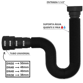 Sifão sanfonado universal 73cm preto O sifão sanfonado universal é um acessório essencial de encanamento, projetado para se adaptar a qualquer saída de válvula de pia e a qualquer tubulação de esgoto, independentemente de seu tamanho ou tipo. Além disso, o sifão sanfonado corrige possíveis desalinhamentos entre a cuba e a tubulação de despejo, evitando assim a formação de bloqueios e obstruções que possam causar vazamentos ou refluxo de água suja. Esse acessório é ideal para tanques, pias e cubas em banheiros, cozinhas e lavanderias. Ele também é resistente a altas temperaturas, suportando água fria e quente até 90c, o que o torna adequado para ser em qualquer tipo de ambiente. Este sifão é compatível com tubos e conexões de 38, 40, 48 e 50mm, garantindo uma instalação fácil e segura, sem necessidade de ferramentas especiais. Ele é feito de plástico abs de alta qualidade, o que o torna resistente a rachaduras, corrosão e vazamentos, garantindo sua durabilidade ao longo do tempo. Em resumo, o sifão sanfonado universal é uma solução confiável e prática para quem procura um acessório de encanamento que seja fácil de instalar e que possa se adaptar a diversas situações de encanamento. Sua capacidade de corrigir desalinhamentos e impedir o retorno de mau cheiro da tubulação de esgoto torna-o uma escolha inteligente e eficaz para garantir a segurança e higiene em sua casa ou negócio. O produto segue montado e pronto para instalação Especificações técnicas Material: polipropileno Entrada para válvula polegada : 7/8 Saída para tubos e conexões: 38, 40, 48 e 50mm Modelo: para pias, cubas, tanques, lavatórios e válvula americana Suporta temperatura até: 90 graus Cor: preto Acabamento: brilhante Manual de instalação: sim Itens inclusos 05 sifões universal 05 adaptadores universal Marca: Não Informado Ean: 7894141421540