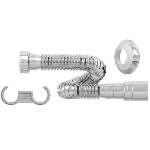 Diâmetro de saída: DN 38, 40, 48 e 50. Comprimento aberto: 1500 mm. Comprimento fechado: 570 mm. Temperatura mínima: -20 °C. Temperatura máxima: 90 °C. Acabamento: cromado. Bucha de redução (roscas 7/8" e 1.1/4") com vedantes. Porca do tubo com rosca de 1.1/2". Material não aderente a gordura. Não necessita ferramentas de instalação. Acompanha suporte para ajuste do tubo e canopla. Aplicação: instalação de pias, lavatórios e tanques.Composição: Elastômeros e plástico de engenharia.