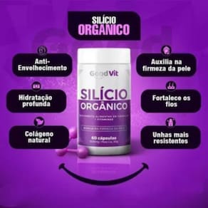 Descrição Sílicio Orgânico Good Vit (Suplemento Alimentar em Cápsulas) CADA UNIDADE: 60 Cápsulas 500mg O silício orgânico, muitas vezes na forma de ácido ortossilícico, tem ganhado atenção devido aos seus possíveis benefícios para a saúde. Alguns dos benefícios associados ao silício orgânico incluem: Saúde para pele, cabelo, unhas, podendo fortalecer e melhorar a aparência destas estruturas.