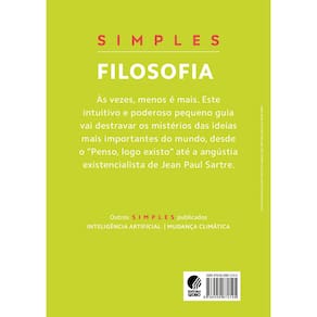 Compreender a filosofia nunca foi tão simples. Este pequeno e poderoso guia apresenta o universo fascinante da filosofia. Aprenda mais sobre as ideias que moldaram o pensamento humano, desde o “Penso, logo existo”, de René Descartes, até a angústia existencialista de Jean Paul Sartre. O título faz parte da coleção Simples, que traz livros que abordam temas atuais, e muitas vezes complexos, de forma simples e direta. Com infográficos, ilustrações e textos dinâmicos, o livro apresenta teorias marcantes de grandes filósofos e pensadores, além de conceitos essenciais das principais escolas filosóficas, como o empirismo, o racionalismo, o dualismo e o materialismo. A obra é ideal para estudantes, educadores e curiosos, e também para os fãs da coleção best-seller As Grandes Ideias de Todos os Tempos.