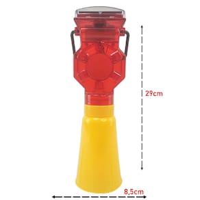 Fabricado com 02 lentes circulares de 180+180 graus translúcida em policarbonato na cor âmbar e corpo em polietileno de alto impacto, facilmente visível dia e noite. O sinalizador eletrônico possui sistema de fotocélula para ligar automaticamente no escuro (Com o Sinalizador ativado), e painel solar para carregamento das baterias. O Sinalizador pode ser utilizado em dias chuvosos.