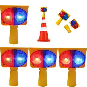 duas cores, sendo vermelho e azul. O Sinalizador Solar oferece iluminação contínua e um longo alcance de visibilidade. Ideal para canteiros de obras,