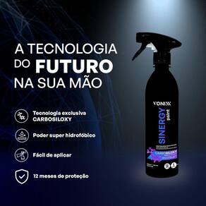 Descrição Sinergy é coating spray de fácil aplicação desenvolvido para pintura de automóveis e tem como função proteger a pintura por até 12 meses. O diferencial desse produto é a sua tecnologia exclusiva vonixx, carbosiloxy, onde o elemento químico carbono age em sinergia com o silício e com isso, forma um filme resistente e super hidrofóbico e tem um tempo de cura menor, em média 60 minutos. Além disso, esse produto reduz o atrito, minimizando riscos e promovendo um excelente brilho.
