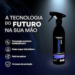 Descrição Sinergy é coating spray de fácil aplicação desenvolvido para pintura de automóveis e tem como função proteger a pintura por até 12 meses. O diferencial desse produto é a sua tecnologia exclusiva vonixx, carbosiloxy, onde o elemento químico carbono age em sinergia com o silício e com isso, forma um filme resistente e super hidrofóbico e tem um tempo de cura menor, em média 60 minutos. Além disso, esse produto reduz o atrito, minimizando riscos e promovendo um excelente brilho.