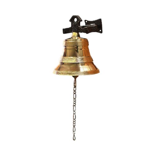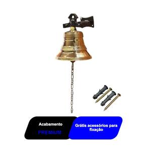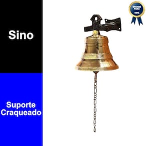 Especificações técnicas: - Sino fabricado em liga de bronze. - Suporte para parede/teto craqueado. - Dimensões do sino com suporte: 16cm (A) x 12cm (D). - Dimensões do sino sem suporte: 11cm (A) x 12cm (D). - Peso: 1,300Kg. - Cor: Dourado. - Acabamento: Laminado. - Acompanha corrente. - Acompanha acessórios para fixação (2 buchas e 2 parafusos).