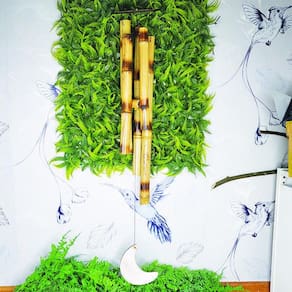 Este modelo em Bambu possui elementos naturais, possui 5 tubos de 25cm a 43cm.Possui uma Lua na ponta para energizar com mais potência.Possui gancho anel para pendurar em qualquer lugar, como varandas, pátios, janelas e etc.