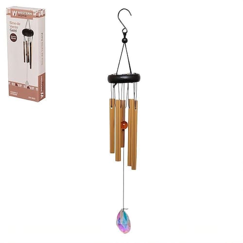 Informações adicionais: Ean: 7897186052519 Validade: indeterminada Tamanho aproximado do sino: 42cm Tamanho aproximado da embalagem: a:18xl:7xp:3cm Peso aproximado: 80g Tipo de produto:sino de vento gold com cristal western home Cor: colorido Composição: metal