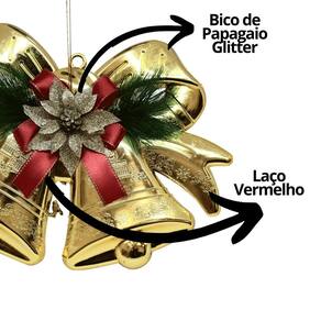 Com acabamento dourado metálico e detalhes de laço decorativo e flor bico de papagaio com glitter, o sino apresenta um visual sofisticado e festivo. O cordão para pendurar garante fácil instalação e versatilidade na decoração de diversos ambientes.