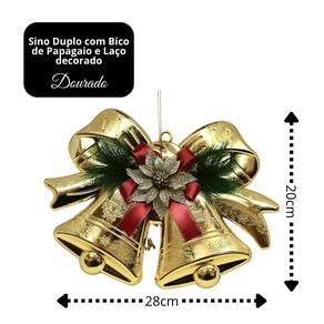 01 Sino Duplo Dourado Decorado com Laço e Flor Bico de Papagaio Glitter 28cm x 20cm