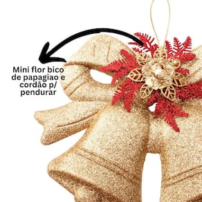 Leve o brilho e a magia do Natal para sua casa com este Sino Duplo Natalino Decorado, um enfeite encantador que vai transformar qualquer ambiente com elegância e espírito natalino. Com acabamento em glitter dourado, o sino traz o charme da tradicional flor Bico de Papagaio vermelha, acompanhada de folhagens decorativas e um toque rústico sofisticado.