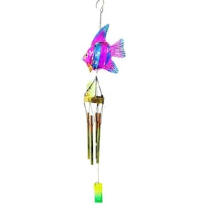 Característica:O sino dos ventos tem detalhes em metal, como o aro de sustentação e partes do corpo da peixe, sendo que essa ainda tem partes em vidro.O suporte em plástico na parte inferior é onde a pessoa pode segurar e balançando fazer os sinos soarem, além do próprio vento que também o faz, ainda que de forma mais sutil.