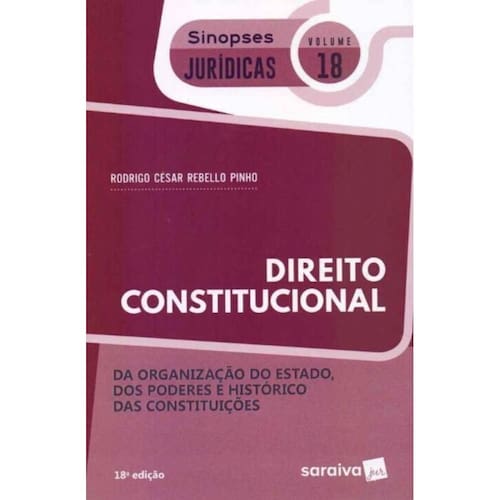A Coleção Sinopses Jurídicas têm como objetivo apresentar uma abordagem concisa dos institutos que compõem os diversos ramos do direito, sem perder a qualidade doutrinária. O volume 18, de Direito Constitucional, trata da organzação do Estado, dos Poderes e histórico das Constituições, uma fonte de consulta rápida, coesa, de fácil assimilação, de autoria de Rodrigo César Rebello Pinho.