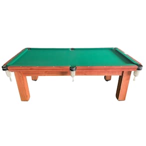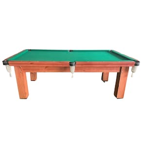 Mesa de sinuca com medidas 2,20x1,20m confeccionada em madeira maciça pinus, campo de jogo em pedra ardósia polida e tapeçada com tecido acrílico Thais na cor verde, modelo com 04 pés, caçapas em redinhas, pés niveladores para melhor nivelamento da mesa e sem acessórios para jogo.