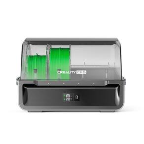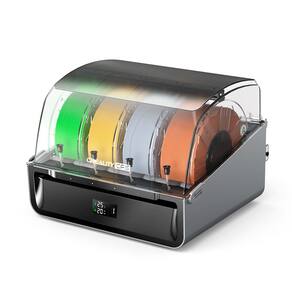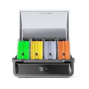 Armazenamento de Filamento à Prova de Umidade: O design hermético mantém os filamentos secos. Uma tela exibe a temperatura e a umidade interna.