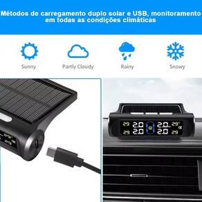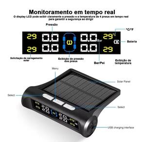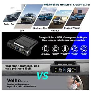 Sistema de Monitoramento de Pneus TPMS com Carregamento Solar - Preto Mantenha seus pneus sempre sob controle com o Sistema de Monitoramento de Pneus TPMS, ideal para quem busca segurança e eficiência nas estradas. Com tecnologia de ponta e carregamento solar, este dispositivo é perfeito para manter o equilíbrio da pressão e temperatura dos pneus do seu veículo, garantindo uma condução mais segura e econômica. Principais Características: Carregamento Solar Inteligente: Equipado com painel solar integrado, o TPMS elimina a necessidade de trocas frequentes de bateria, aproveitando a energia solar para funcionar de forma sustentável. Perfeito para viagens longas ou uso diário. Monitoramento em Tempo Real: Receba informações instantâneas sobre a pressão e temperatura dos pneus no display digital LCD, permitindo uma resposta rápida a qualquer irregularidade, prevenindo desgastes desnecessários e acidentes. Design Compacto e Elegante: O sistema possui um design discreto, em cor preta, que combina com qualquer interior de veículo sem comprometer o visual. Além disso, sua instalação é fácil e rápida. Alerta Automático: O TPMS emite alertas sonoros e visuais sempre que a pressão ou a temperatura dos pneus estiverem fora dos níveis recomendados, ajudando a evitar explosões de pneus e aumentar a vida útil deles. Alta Compatibilidade: Este sistema é compatível com a maioria dos veículos, desde carros de passeio até SUVs e caminhonetes, tornando-o versátil para diversos tipos de motoristas. Resistência à Água e Poeira: Com proteção IP67, o sistema é resistente a condições adversas, como água e poeira, garantindo o funcionamento contínuo em qualquer clima ou ambiente. Sensores Externos de Alta Precisão: O kit inclui quatro sensores externos, que podem ser facilmente instalados em cada pneu, oferecendo medições precisas com baixo consumo de energia. Benefícios: Economia de Combustível: Manter a pressão correta dos pneus pode aumentar a eficiência do combustível, ajudando a economizar em viagens longas. Aumento da Durabilidade dos Pneus: A detecção precoce de problemas ajuda a prolongar a vida útil dos pneus, reduzindo custos com substituições. Segurança Ampliada: Ao prevenir possíveis falhas nos pneus, como explosões devido ao superaquecimento, o TPMS proporciona uma direção mais tranquila e segura para você e sua família. Especificações Técnicas: Tipo de alimentação: Carregamento solar e USB Tela: Display LCD de alta definição Sensores: 4 sensores externos, à prova d'água IP67 Temperatura de operação: -20C a 80C Faixa monitorada: 0 - 6 Bar Alerta baixa/alta: Sim Alerta de temperatura alta: Sim Dimensões: Compacto, fácil de instalar no painel do carro Invista na segurança e no desempenho dos seus pneus com o Sistema de Monitoramento de Pneus TPMS com Carregamento Solar. Um acessório indispensável para quem busca proteção e economia nas estradas.