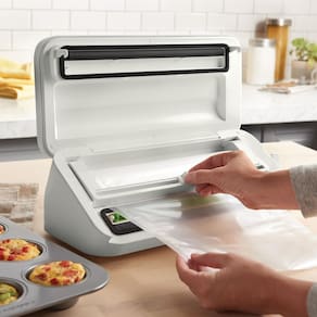 FoodSaver VS2150 Sistema de vedação a vácuo, seladora a vácuo de alimentos, branco/prata - Mantenha os alimentos frescos por mais tempo: o sistema de vedação a vácuo FoodSaver VS2150 mantém os alimentos frescos por até 5 vezes mais tempo em comparação com métodos de armazenamento comuns e ajuda a evitar queimaduras no freezer - Cortador de rolo e barra de armazenamento: esta seladora a vácuo FoodSaver possui armazenamento de rolo integrado e uma barra de corte para fazer facilmente sacos de tamanho personalizado sem tesoura, e comporta sacos de 8 e 28 cm perfeitamente - Uma ótima vedação sempre: os modos úmido e seco garantem uma vedação hermética para cada tipo de alimento, e a ferramenta de alinhamento de saco integrada alinha corretamente sua bolsa de armazenamento a vácuo para uma vedação adequada sempre - Outras características convenientes: bandeja coletora removível segura na máquina de lavar louça para facilitar a limpeza; trava fácil de travar para operação com uma mão enquanto você segura a bolsa; e selante portátil, porta de acessórios e mangueira para que você também possa usar bolsas com zíper, recipientes e muito mais - Compatibilidade: esta seladora a vácuo FoodSaver é compatível com todos os sacos, rolos e acessórios FoodSaver - O kit de partida inclui: um rolo de vedação a vácuo de 28 cm x 2,4 m; 2 sacos de vedação a vácuo do tamanho de um litro; 2 sacos de vedação a vácuo do tamanho de um galão; e 1 selante portátil e mangueira de acessórios