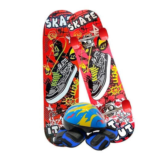 - Skate com shape de madeira - Acompanha capacete, joelheira e cotoveleira - Vem com bolsa para transporte - Indicado para crianças maiores de 6 anos