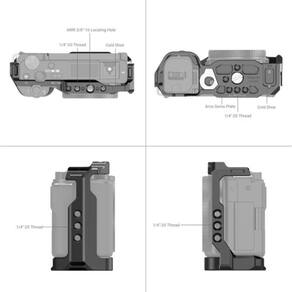 A gaiola incorpora várias roscas antitorção de 1/4-20 e 3/8-16, e há montagens de sapata na parte superior e inferior para uma luz ou microfone. A parte inferior da gaiola é rosqueada com várias roscas de montagem de 1/4-20 para conectar uma placa de câmera para montagem em tripé. Há slots de alça nas laterais para adicionar uma alça de pulso ou pescoço disponível separadamente. Uma chave allen magnética é incluída para prender a gaiola na câmera.