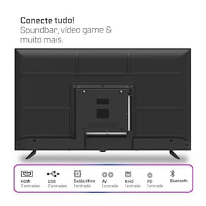 - Conectividade completa: 3 HDMI, 2 USB, AV, RJ45, saída óptica e entrada para fone (P2);