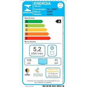 - Tela LED 43 Polegadas Full HD (1920 x 1080 pixels) - Frequência: 60 Hz - Tempo de resposta: 6,5 ms - Design sem borda minimalista - Contraste dinâmico HDR10 - Modos de cor: Frio, Padrão, Quente e Personalizado - Dolby Audio estéreo 20W (10W x2 RMS) - Conectividade: Wi-Fi integrado, Bluetooth - Entradas: 2 HDMI, 2 USB 2.0, 1 LAN, 1 Antena/cabo, 1 Áudio Digital (óptico), 1 Adaptador AV - Consumo: 80W – Bivolt automático - Eficiência energética: Selo ENCE AAA - Padrão de tomada: 10A – 3 pinos - Dimensões sem base (LxAxP): 955 x 550 x 80 mm - Dimensões com base (LxAxP): 955 x 607 x 185 mm - Dimensões da base (LxAxP): 80X55 mm - Peso sem base: 5,1 kg - Peso com base: 6,5 kgVendido e entregue por Casas Bahia