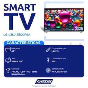 Se você está em busca de uma televisão moderna, com excelente qualidade de imagem, som imersivo e recursos inteligentes, a Smart TV LG 43UA7500PSA é a escolha ideal. Desenvolvida para oferecer uma experiência completa de entretenimento, esta TV combina tecnologia de ponta com um design elegante, ideal para qualquer ambiente da casa. Com resolução 4K, conectividade avançada e comando de voz, ela proporciona muito mais praticidade e imersão para o seu dia a dia. Confira mais detalhes:
