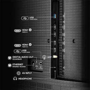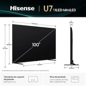 Tecnologia MiniLed, Resolução 4K, Tela de 100 polegadas, Wi-Fi, Bluetooth, 4 Entradas HDMI, 2 Entradas USB, Entrada LAN, Subwoofer Embutido, Dolby Vision IQ, Suporte Vesa 800x400 mm, Frequência de 144 Hz.Características