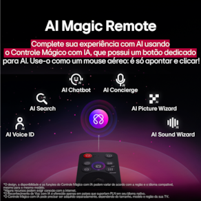 - Tipo de Painel: 4K UHD VA - Frequência Nativa: 60Hz Nativo - Processador: a7 AI Processor 4K Gen8 - HDR (High Dynamic Range): HDR10 / HLG - Saída de Áudio: 20W - Sistema de Som: 2.0 Canais - Peso sem base: 11,5kg - Peso com base: 11,6kg OBSERVAÇÃO - Este modelo de TV LG oferece uma experiência de visualização de alta qualidade e recursos inteligentes, mas não possui a funcionalidade Multi View (tela dividida). No entanto, você continua desfrutando da performance excepcional da sua TV LG.Vendido e entregue por Casas Bahia