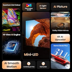 - Smart TV 55” 4K UHD Hisense 55U6QV - Tamanho da tela: 55” - Resolução: 4K UHD (3840 x 2160) - Tecnologia do painel: Mini LED - Tipo de painel: VA - Sistema operacional: Vidaa - Processador: AI - Frequência: 60Hz - Brilho: 600 nits - Ângulo de visão: 178° - Tempo de resposta: 8 ms - Armazenamento interno: 32 GB - Conversor digital: Integrado - Wi-Fi: Integrado - HDR: Dolby Vision, Dolby Vision IQ, HDR10+, HDR10, HLG, HDR10+ Adaptive - Modo de imagem: FilmMaker Mode - Áudio: Estéreo - Potência sonora: 20W - Tecnologias de áudio: Dolby Atmos, Dolby Gaming - Espelhamento de tela: MiraCast - Compatibilidade: Alexa e Google - 4 Entradas HDMI - 2 Portas USB - Saída para fone de ouvido: P2 - Voltagem: Bivolt - Cor: PretaVendido e entregue por Casas Bahia