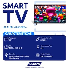Com recursos inteligentes integrados, a Smart TV LG 86UA8550PSA proporciona uma navegação prática e intuitiva. O comando de voz permite controlar a TV, buscar conteúdos e acessar aplicativos com mais comodidade, tudo por meio da sua voz. A interface moderna e o acesso facilitado aos principais serviços de streaming tornam a experiência ainda mais completa, promovendo conveniência e tecnologia no seu dia a dia.