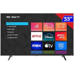 Smart TV AOC OLED 55 4K Wi-Fi HDR10 HDMI 55U7045/78G. Tela de 55 polegadas com resolução 4K UHD e painel IPS com tecnologia DLED. Suporte para HDR10. Taxa de atualização de 60 Hz, tempo de resposta de menos de 8 ms e input lag de até 20 ms. Design sem bordas. Sistema de som 2.0 com potência total de 16W (2 x 8W) e processamento Dolby Digital. Sistema Roku Smart integrado com acesso a aplicativos como Netflix, YouTube, Disney+, Prime Video. Conectividade: 3 entradas HDMI (sendo uma com eARC), 1 USB 2.0, Wi-Fi dual band, Ethernet RJ-45 e suporte para espelhamento de tela com AirPlay 2.Tamanho da tela