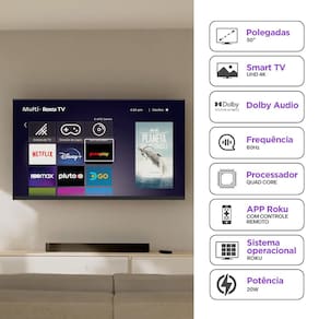 A Smart TV DLED de 50 polegadas entrega resolucao 4K HDR -3840 x 2160-, garantindo imagens ultra definidas, cores vibrantes e excelente nivel de contraste. Com o sistema Roku TV, voce acessa facilmente aplicativos como Netflix, Disney+, TV, MAX, Prime Video, Globoplay, Paramount+, Mubi e outros disponiveis na Roku Store -assinaturas nao inclusas-.