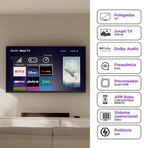 A Smart TV DLED de 50 polegadas entrega resolucao 4K HDR -3840 x 2160-, garantindo imagens ultra definidas, cores vibrantes e excelente nivel de contraste. Com o sistema Roku TV, voce acessa facilmente aplicativos como Netflix, Disney+, TV, MAX, Prime Video, Globoplay, Paramount+, Mubi e outros disponiveis na Roku Store -assinaturas nao inclusas-.