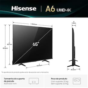 Smart TV DLED 4K com Processador AI, Dolby Vision, Dolby Gaming, VIDAA U9, ALLM, VRR, MiraCast, DLNA, compatibilidade Alexa e Google Home.A Smart TV Hisense 65A6NV de 65" polegadas oferece uma experiência envolvente e prática para entretenimento em casa. Equipada com o sistema VIDAA U9, a TV Hisense proporciona uma navegação intuitiva e fácil acesso aos seus conteúdos favoritos. Com a tecnologia avançada Dolby Vision, HDR10, HLG, Dolby Gaming, Film Maker somado ao Dolby Digital Plus, DTS Virtual X, desfrute de um áudio imersivo e imagem de alta qualidade, ideal para filmes, jogos e esportes. Modos dedicados para games (ALLM, VRR) e esportes garantem uma visualização otimizada, enquanto o controle por voz facilita a navegação sem esforço. Além disso, é possível espelhar a tela de dispositivos móveis para a TV com MiraCast, DLNA, ampliando as opções de visualização e entretenimento. Compatibilidade Alexa, Google Home, a integração na sua casa inteligente é perfeita. Descubra o mundo de possibilidades da Smart TV Hisense 65A6NV, combinando design elegante com desempenho excepcional para uma experiência de visualização superior.