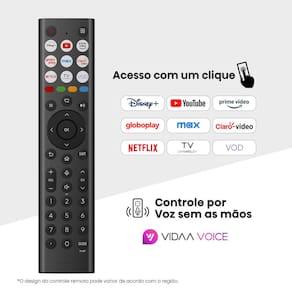 Bem vindo ao futuro da TV. O nosso sistema operacional de última geração unifica perfeitamente os melhores conteúdos nacionais e internacionais, adaptando às suas preferências exclusivas para um acesso fácil de encontrar. Mergulhe em um mundo de entretenimento sem fim, com os programas mais bem avaliados, filmes de grande sucesso e muito mais tudo personalizado e convenientemente acessível. Atualize a sua experiência de visualização hoje e assuma o controle das suas opções de entretenimento Características: Modelo: 756NV Sistema Operacional: VIDAA U9 Idioma do Display: Inglês, Espanhol, Português e Francês Wi-Fi: Sim Bluetooth: Sim Tamanho da Tela: 75 polegadas Tipo de Tela: LED Resolução: 4K 3840x2160 Taxa de Movimento: 60Hz Brilho Máximo: 300typ Ângulo de Visão: 178 graus Tempo de Resposta: 8ms Luz de Fundo: DLED IA: Sim (AiPQ) Aprimoramento de Imagem: Sim Potências: 2x 15W Tipo de Alto-falante: Embutido Áudio Bluetooth: Sim Aperfeiçoamento de Som: Dolby Digital Plus, DTS Virtual X Smart TV: Sim (VIDAA U9) App Store: Sim (VIDAA Store) Consumo de Energia: 190W Consumo em Standby: menor/igual 0.5W Fonte de Alimentação: AC100-240V, 50/60Hz Compatível com Assistente Virtual: Sim Compatível com Google Smart Home: Sim Compatível com Google Assistant: Sim